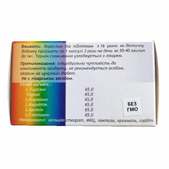 Склад мг / капс .: L-карнітин - 65,0, таурин - 65,0, L-глютамін - 65,0, L-карнозин - 65,0, L-аргінін - 65,0, L-тирозин - 65, 0.