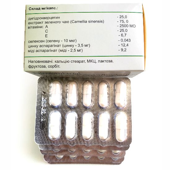 Склад: дигідрокверцетин - 25 мг; екстракт зеленого чаю (Camellia sinensis) - 75 мг, вітаміни: А - 2500 МО, С - 25 мг, Е - 6,7; селексен (селен - 10 мкг) - 0,043 мг, аспарагинат цинку (цинк - 3,5 мг) - 12,4 мг, аспарагинат міді (мідь - 2,5 мг) - 9,2 мг.