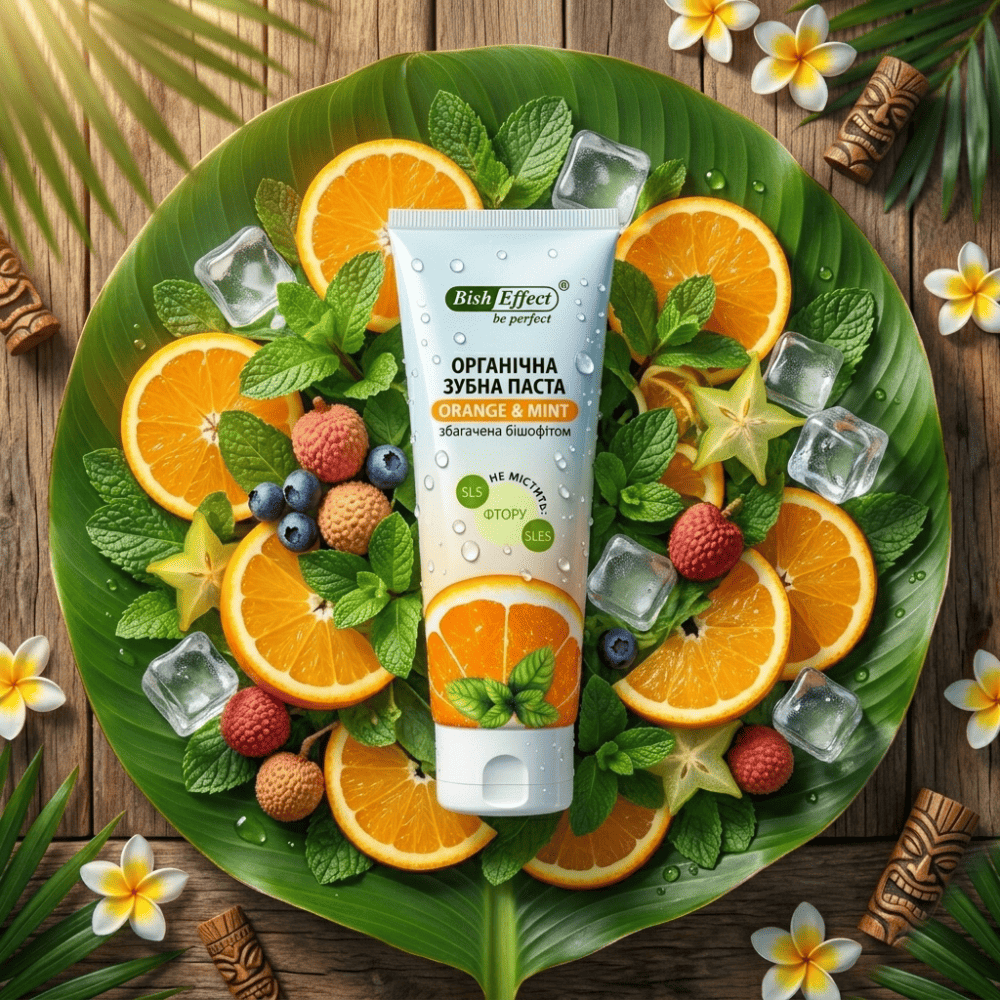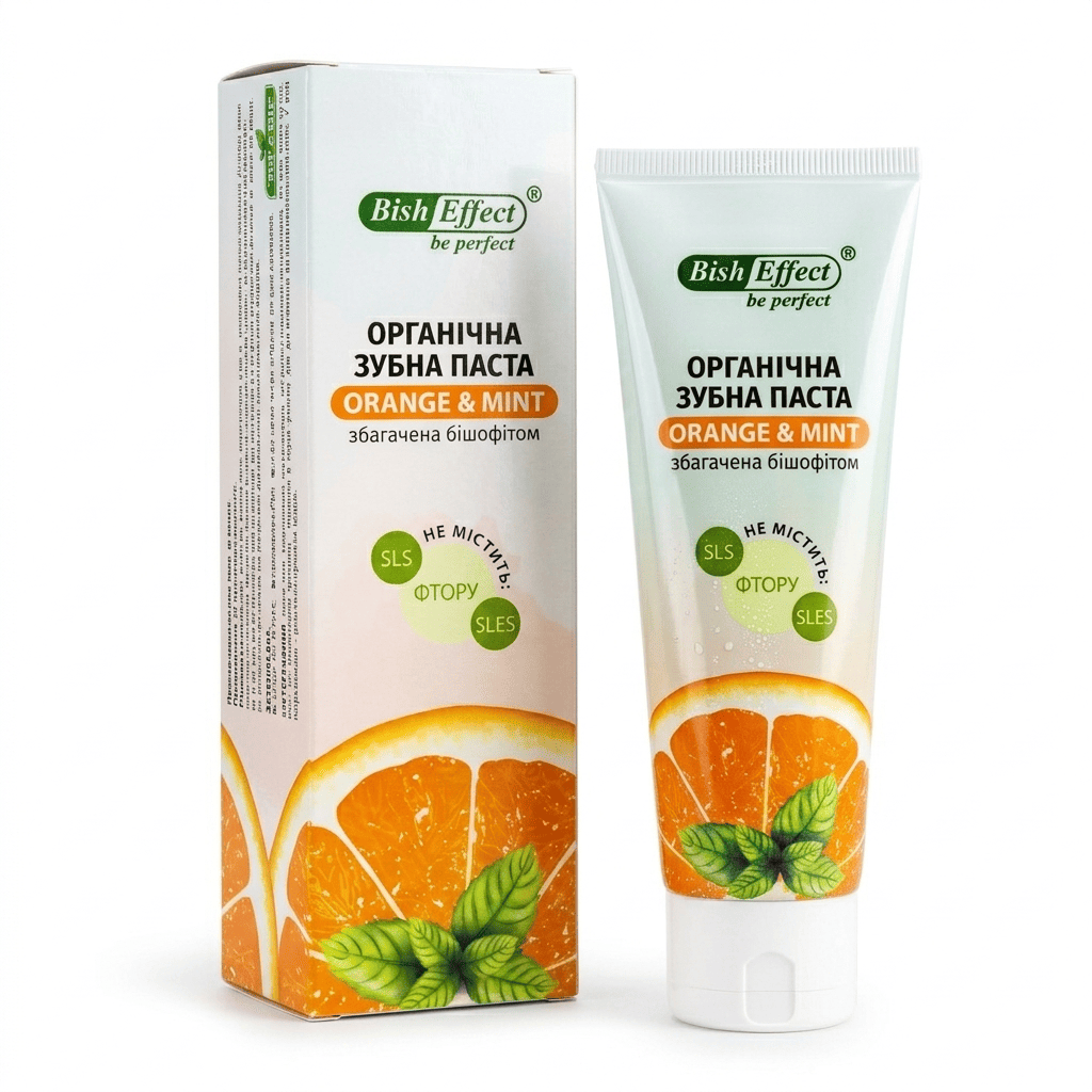 - Особливість: Натуральний склад, без фтору та агресивних компонентів, з бішофітом, екстрактом апельсина і м'яти для дбайливого догляду та приємного смаку.