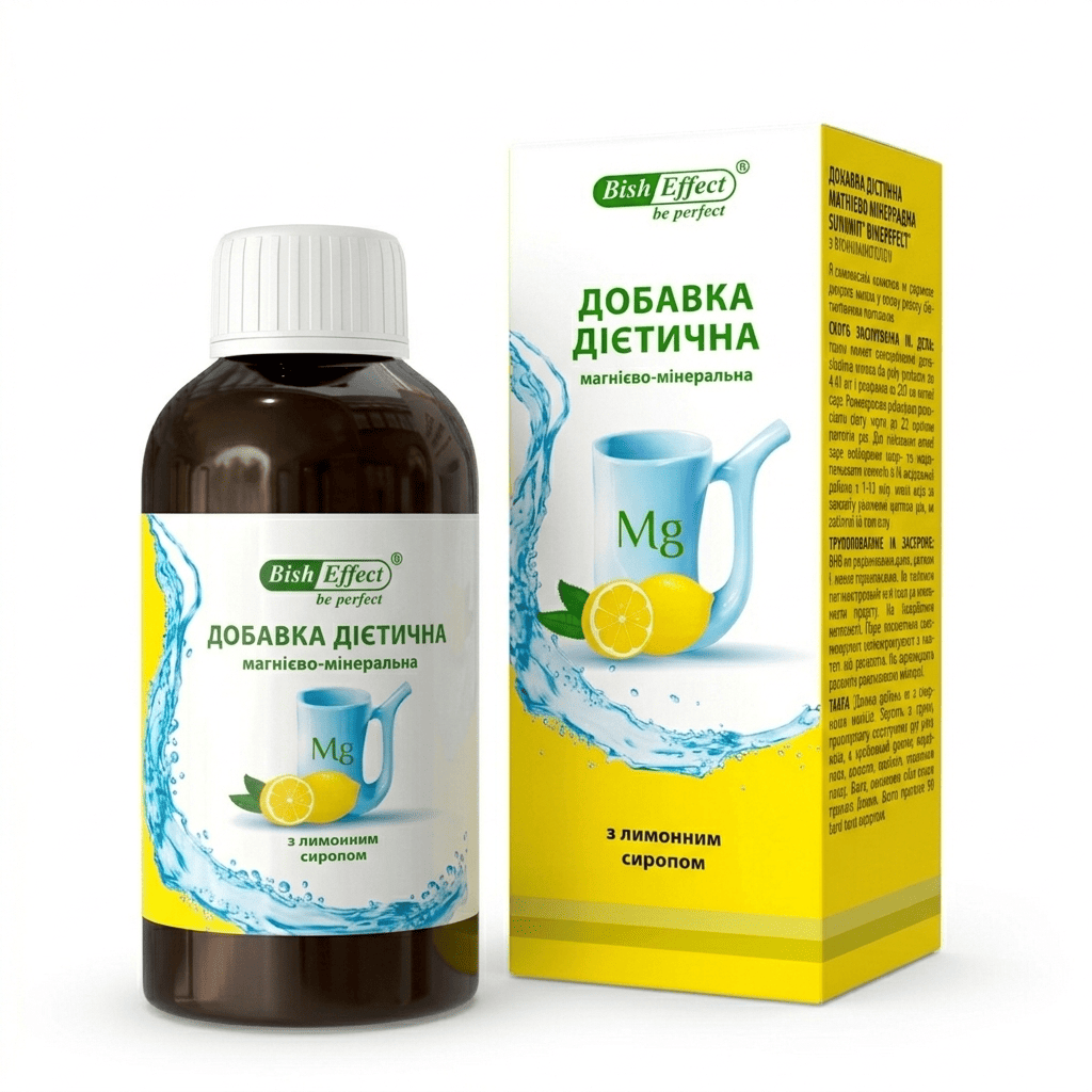 Питний бішофіт з лимонним сиропом можна додавати не тільки у воду, а й у трав'яні чаї, компоти або морси — це урізноманітнить смак і зробить прийом більш приємним. Для зручності можна розвести добову дозу (до 10 мл) у літровій пляшці води та пити протягом дня. Курс 25–30 днів оптимальний для підтримання рівня магнію, після чого рекомендується зробити перерву 1–2 місяці.