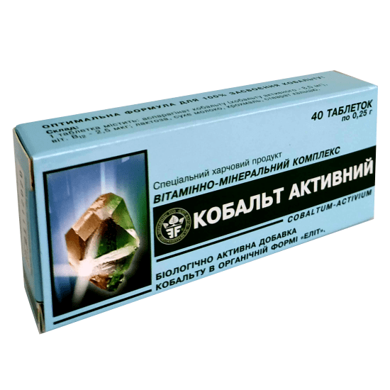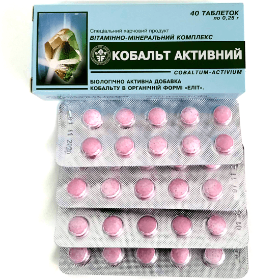 Склад: 1 таблетка містить аспарагинат кобальту (активний кобальт - 8,0 мг), віт. B12 - 2,5 мкг лактози, сухе молоко, крохмаль, стеарат кальцію.