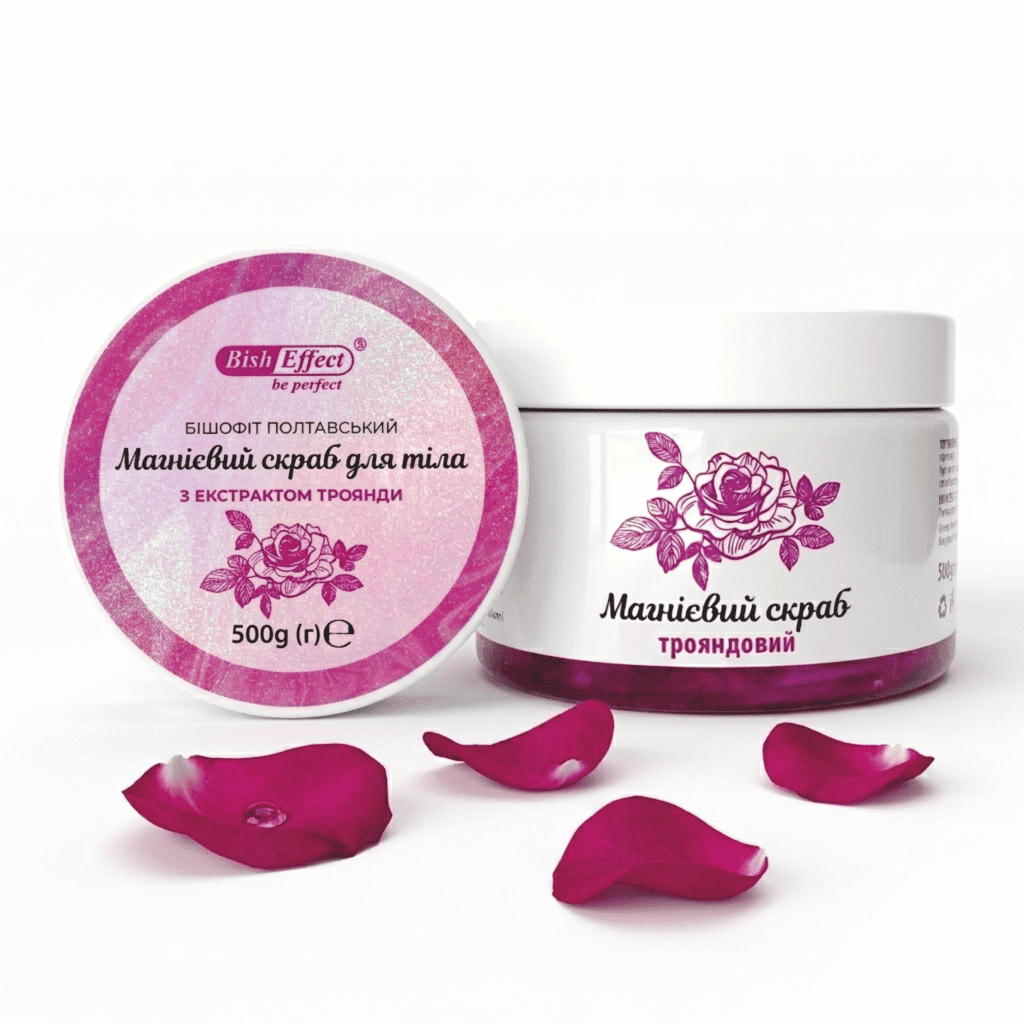 Магнієвий скраб для тіла з екстрактом троянди Бішофіт Полтавський 500 г — це натуральний косметичний засіб для догляду за шкірою на основі природного хлориду магнію з Полтавського родовища з додаванням екстракту пелюсток троянди. Збільшений формат 500 г розрахований на тривале регулярне використання для всієї родини. Морська сіль делікатно відлущує ороговілі клітини, а олії та екстракт троянди живлять, зволожують і заспокоюють шкіру. Бішофіт збагачує шкіру магнієм, сприяючи її м'якості та доглянутому вигляду. Ніжний квітковий аромат троянди перетворює процедуру скрабування на справжній SPA-ритуал. Економний об'єм дозволяє не економити на процедурах.