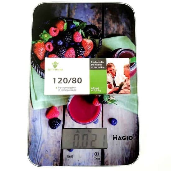 Склад: Дигідрокверцетин  - 0,01 г, Екстракт зеленого чаю – 0,05 г, L-карнітін - 0,05 г, Магній (оротат, аспарагінат) доб. - 0,025 г, Вітамін Е  - (доб.) - 0,002 г, Вітамін А  (доб.) -  0,000166 г,  Кислота аскорбінова (віт.С)  - 0,01 г, Екстракт  глоду - 0,05 г. Наповнювачі: крохмаль картопляний, МКЦ, лактоза (фруктоза, сорбіт), стеарат кальцію. Біодобавка “120/80”- це живильний комплекс, необхідний  для підтримки серцевої діяльності. Дія пояснюється властивостями  його складових.