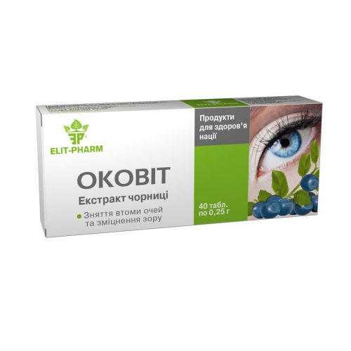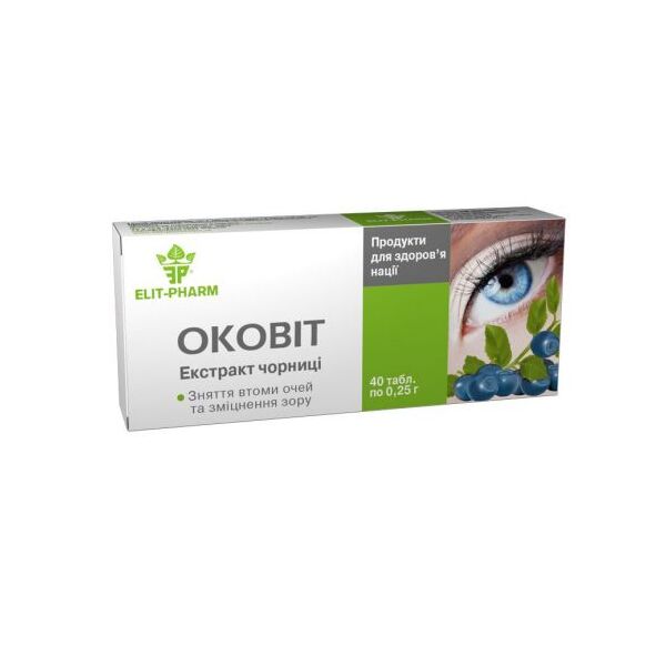 Препарати під торговою маркою "Оковіт" є авторськими розробками фармацевтів компанії "Еліт-Фарм". Рекомендуються як біологічно-активні добавки, які сприяють поліпшенню функцій зорового апарату людини. В основі препарату - екстракт чорниці. Останні дослідження вчених підтвердили давно відомий народній медицині факт - щоб добре бачити, потрібно їсти чорницю. Говорячи науковою мовою - антоціани чорниці сприяють здоров'ю органів зору. Вчені підтвердили, що екстракт чорниці зберігає корисні властивості ягоди - поліпшується циркуляція крові в органах зору, зміцнюються кровоносні судини в очному яблуці, що призводить до кращого постачання сітківки киснем і корисними речовинами. В результаті - зір поліпшується, що особливо помітно в сутінках. Знімається втома очей, що виникла від високих навантажень на зір, відновлюється сприйняття кольорів, зміцнюються капіляри очного дна. Чорниця нейтралізує шкідливий вплив на очі навколишнього середовища: електромагнітного випромінювання від комп'ютера, телевізора, інших побутових приладів. Екстракт чорниці запобігає шкідливому впливу на очі вільних радикалів. Крім того, екстракт чорниці благотворно впливає на серцево - судинну систему людини.